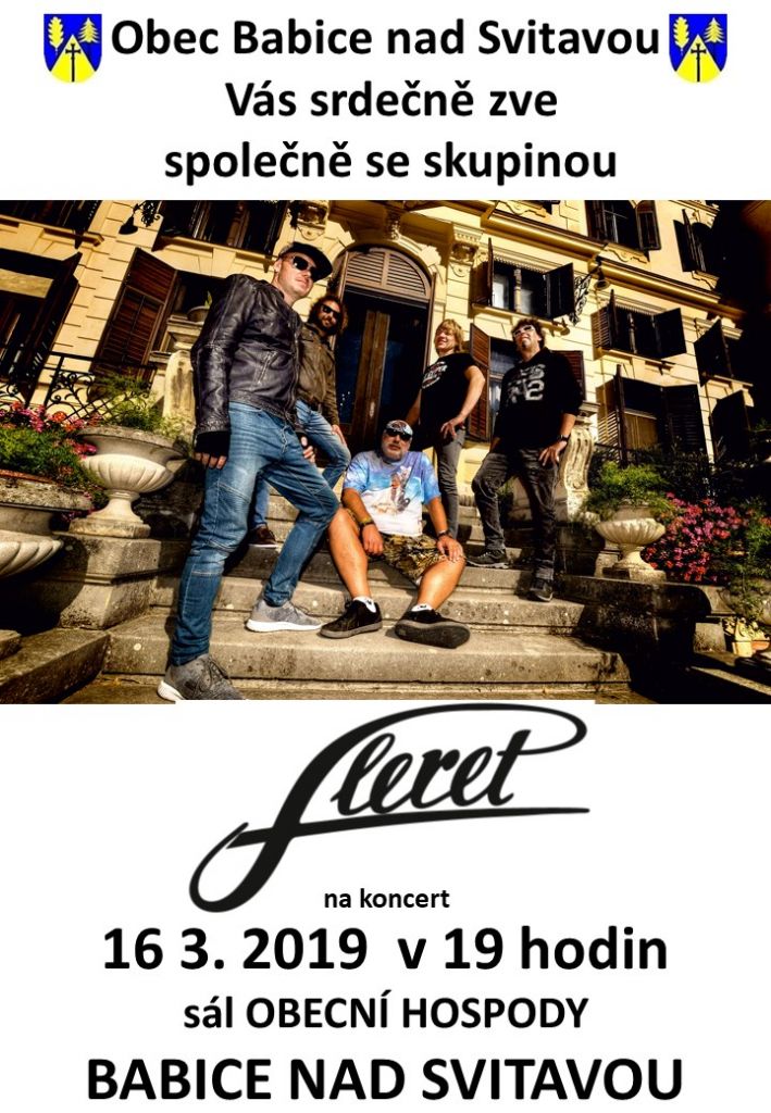 Babice nad Svitavou navštíví FLERETI 16.3.2019 v 19h v sále OBECNÍ HOSPODY.Vstupné 200Kč, rezervace na mailu: obec@babice-nad-svitavou.cz